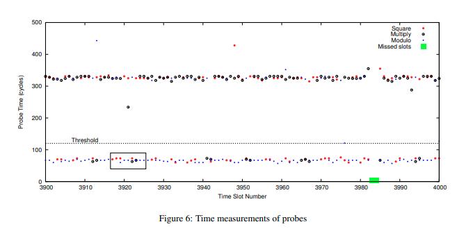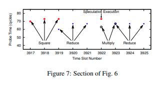 beetween time slots 3,903 and 3,906 the calculated sequence is Square-Reduce, which is followed by a Square, indicating that in these time slots the victim was processing a clear bit.