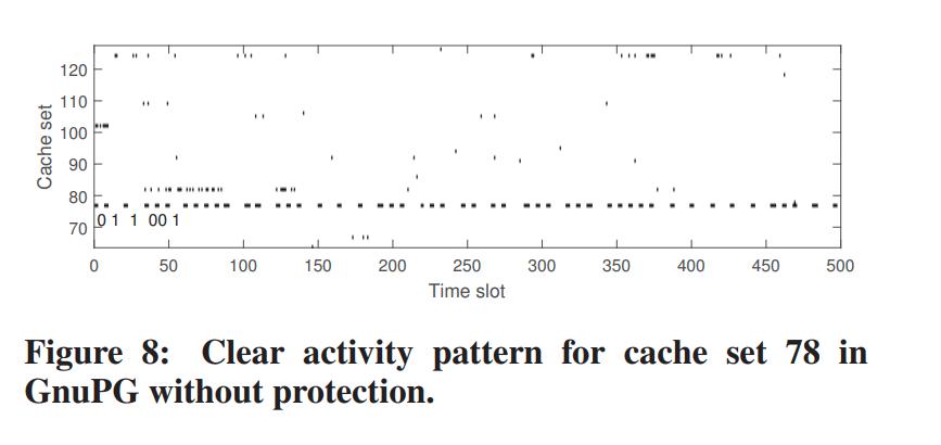 Figure 9a) For GnuPG without protection, an attacker can easily dientify the targeted cache set containing expected cache activity patterns.