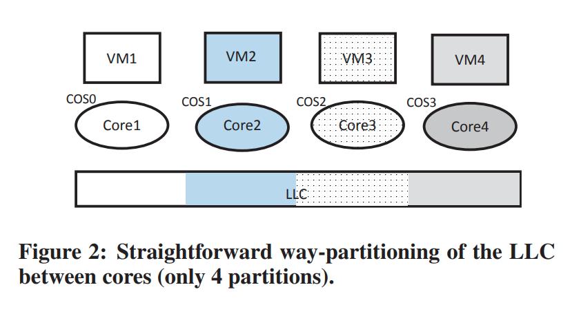 CAT could be trivially used to completely partition the cache, by assigning disjoint COSs to different VMs. (below Figure2)
