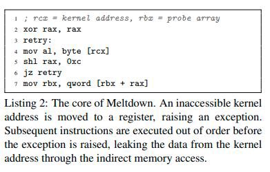 MOV instruction is retired, the exception is registered, and the pipeline is flushed to eliminate all results of subsequent instructions which were executed OoO. →there is a race condition between raising this exception and our attack step 2 as described below.